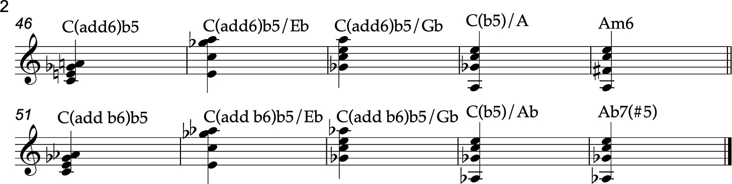 Also a triad with a b6 added contains the identical notes as a first inversion maj7 chord with b6 that was added to the triad as root, i.e., Cm(add b6) = Abmaj7/C. Again, it is context that determines the root. If the sound of a minor triad is established, adding a b6 sounds like a m(add b6). A good example of this is Gary Peacock’s composition Vignette, which is both on Peacock’s album Tales of Another and on the Marcin Wasilewski Trio’s recording January. Both recordings are on the ECM Records label. There is a figure, repeated in different keys, with a minor triad with an added 2nd alternating with a m(add b6).