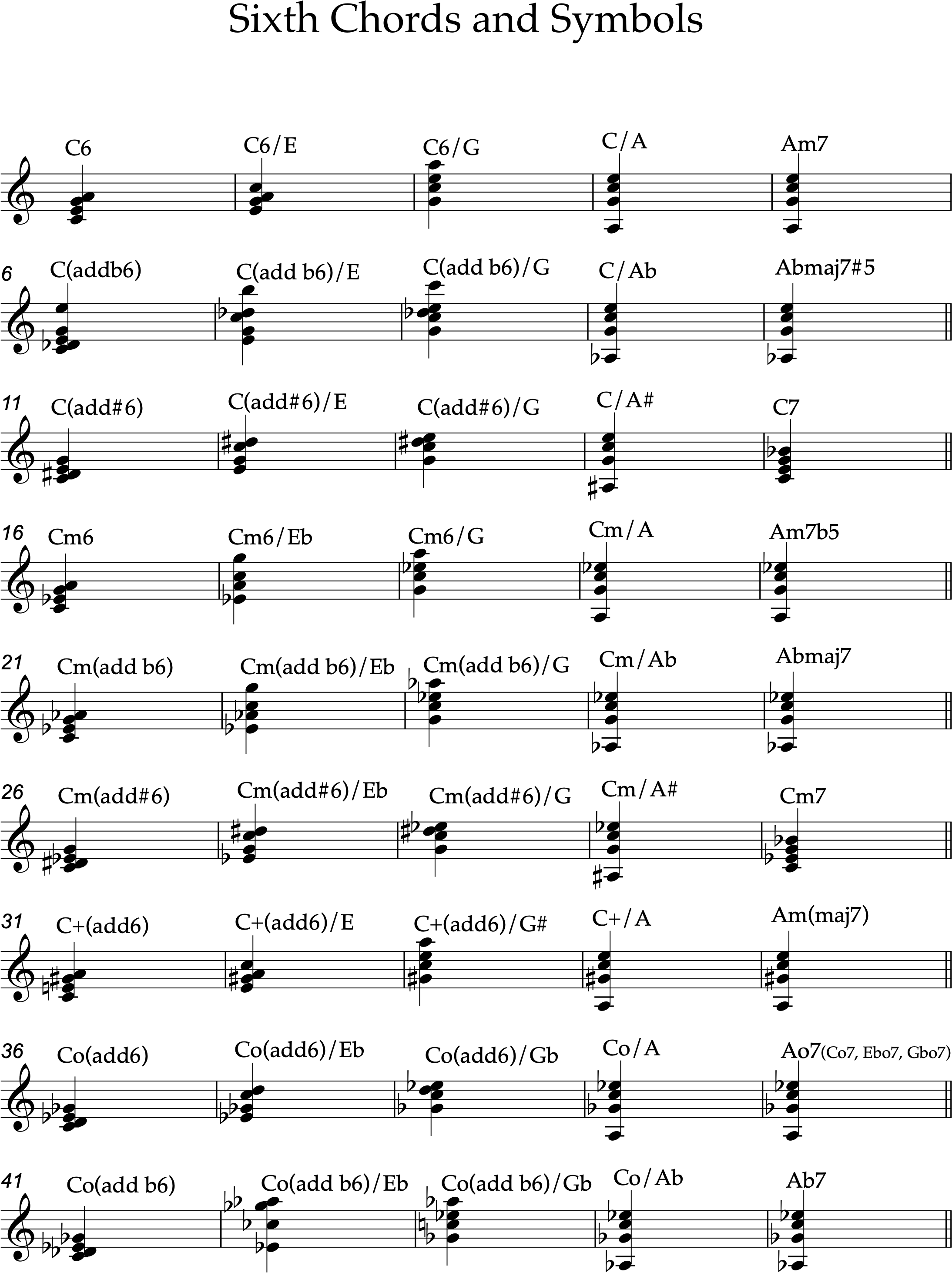 The listing below of sixth chords are arranged in the following manner: