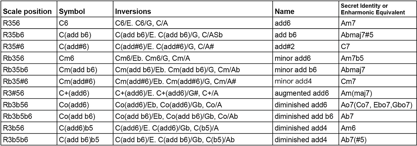 What becomes blatantly obvious is that a sixth chords, all types of sixth chords are also some kind of seventh chord, usually if you use the sixth as root (C6 = Am7), though in a few cases even as the root (C(add#6) = C7).