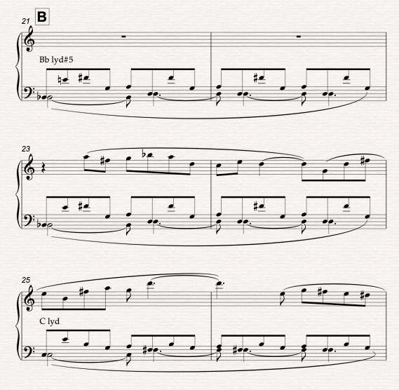 The B section features two harmonies stretched out over an altered rhythmic figure. The Bb lyd#5 emphasizes the juxtaposition of the Bb tonality with the unmistakable presence of the D major triad and then the open, windswept C lydian atmosphere turning around back to the Head with a variation on the A aeolian and A harmonic minor harmonies.