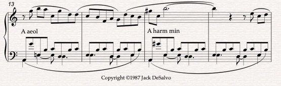 The figure quickly transforms again by raise the 7th of the A to G#, now A harmonic minor with the augmented 2nd space between the b6 and the major 7th defining the mood/mode. While the b6, F natural, doesn’t appear in the melody during the harmonic minor harmony, the ear retains its flavor from the previous measure during Aeolian.
